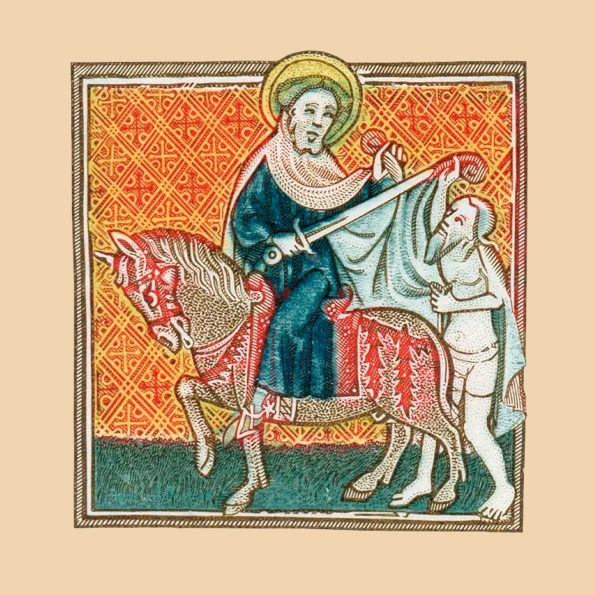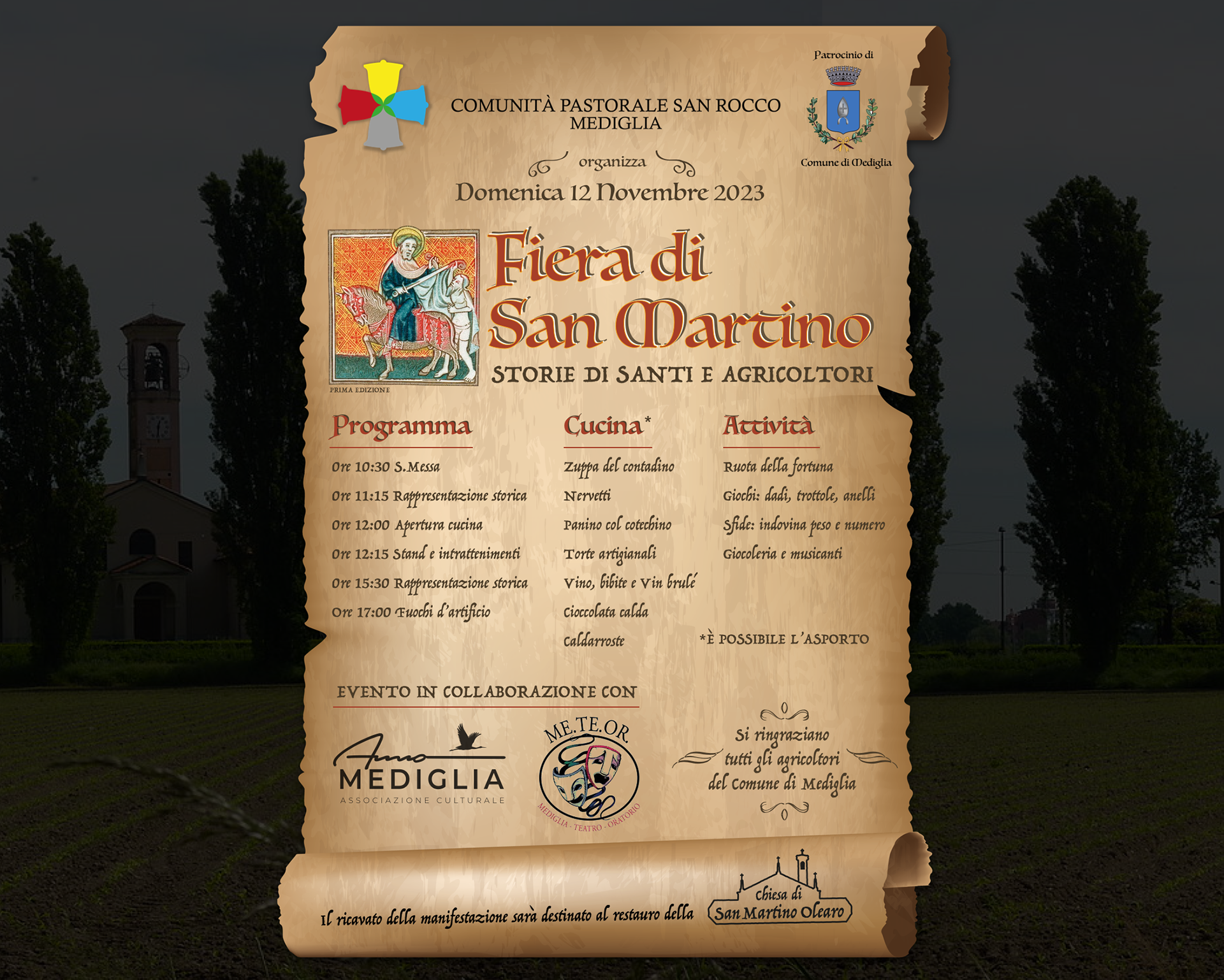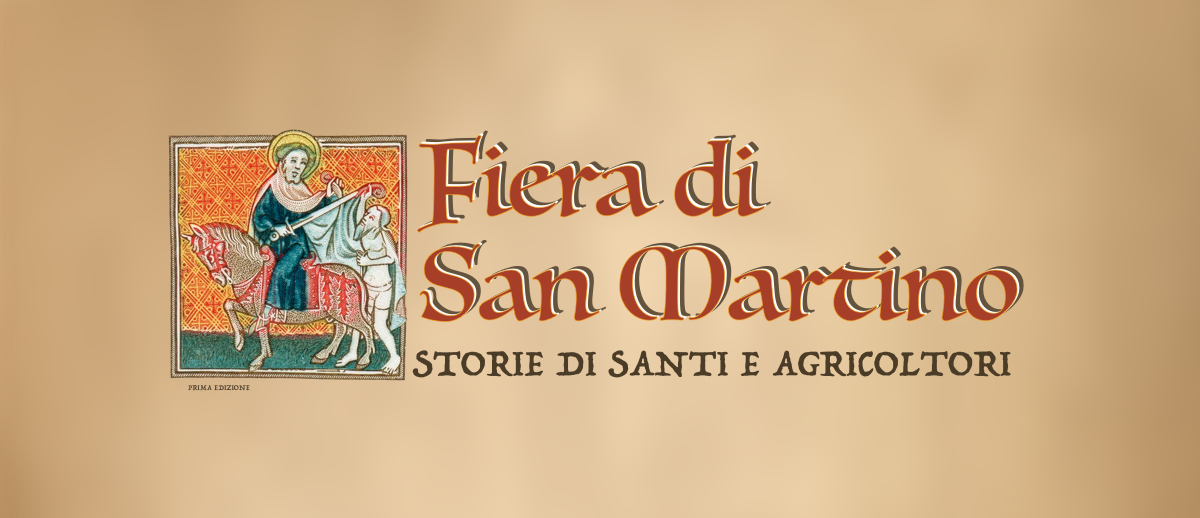 Un effigie che ritrae San Martino a cavallo, tratta da un'incisione eseguita da Claude Jumelet, si affianca alla dicitura "Fiera di San Martino" e al payoff "Storie di santi e agricoltori" creando un logotipo dal sapore antico e miniato.
